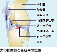 「前十字靭帯」とは、大腿骨と脛骨をつなぐ靭帯のひとつ。過激な運動や肥満、膝関節の構造の問題などが原因で切れることがあるが、 痛みが引くといつものように歩いたりし始めるので、異常を見過ごすことが多い。 |